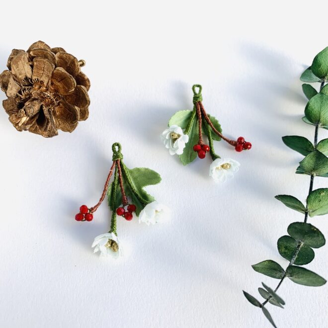 小さな赤い実とグリーンのリーフがほんのりクリスマスっぽいイヤリング。