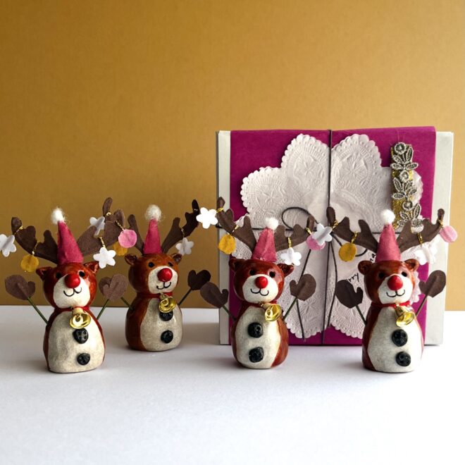 ツノに飾りをたくさんつけておめかししてやって来たトナカイです。