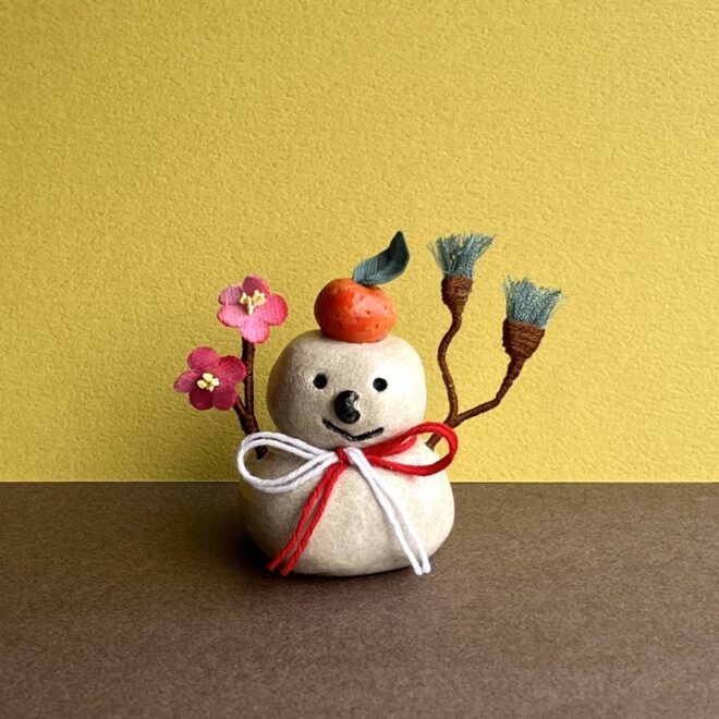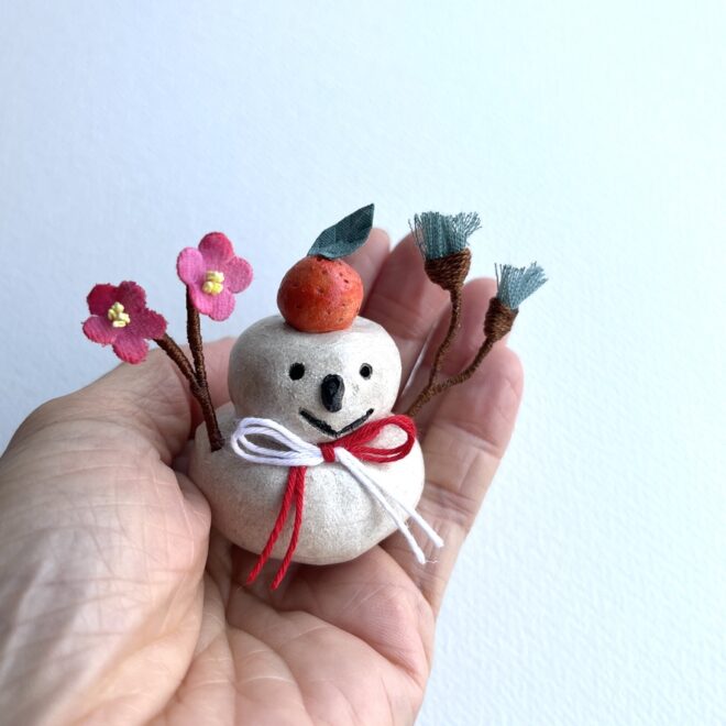 この鏡餅さん梅と松という縁起物の代表な草花をまとっています。