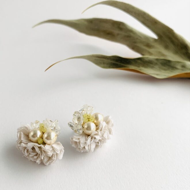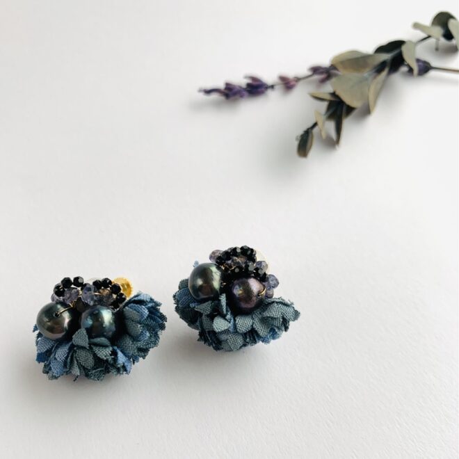 やシルクを1枚づつ染めて制作しており、天然石やパールと組み合わせる事で、