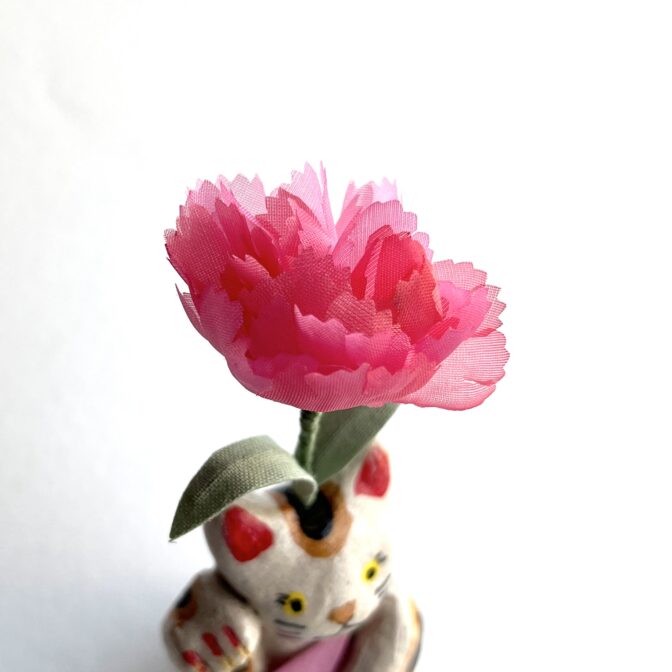 カーネーションの花びらはシルクの生地を使用し、手染めして制作。