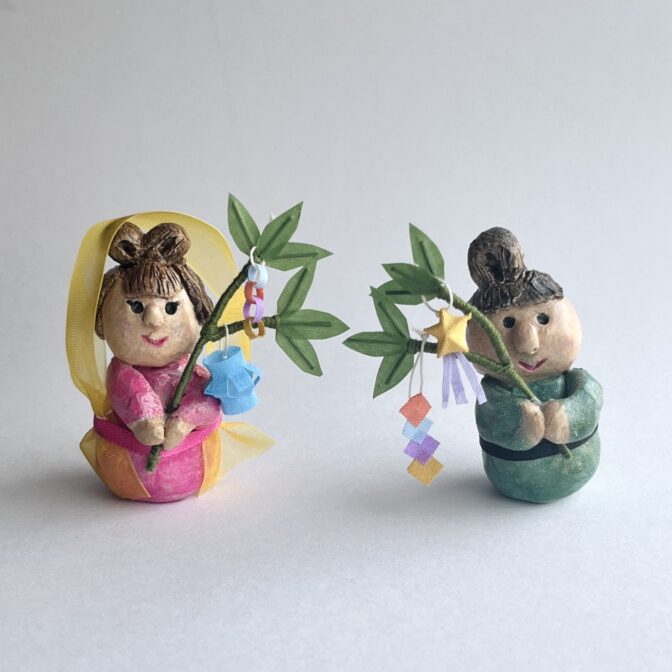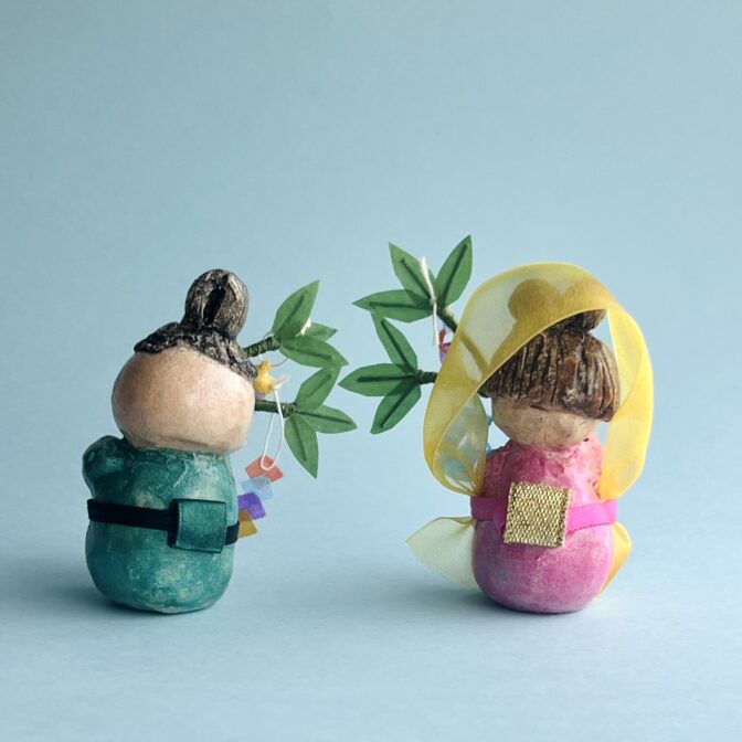 「笹の葉さ〜らさら〜♪」と楽しく歌を歌いながら 織姫さまと彦星さまが、笹の葉飾りを持ってやって来てくれました。